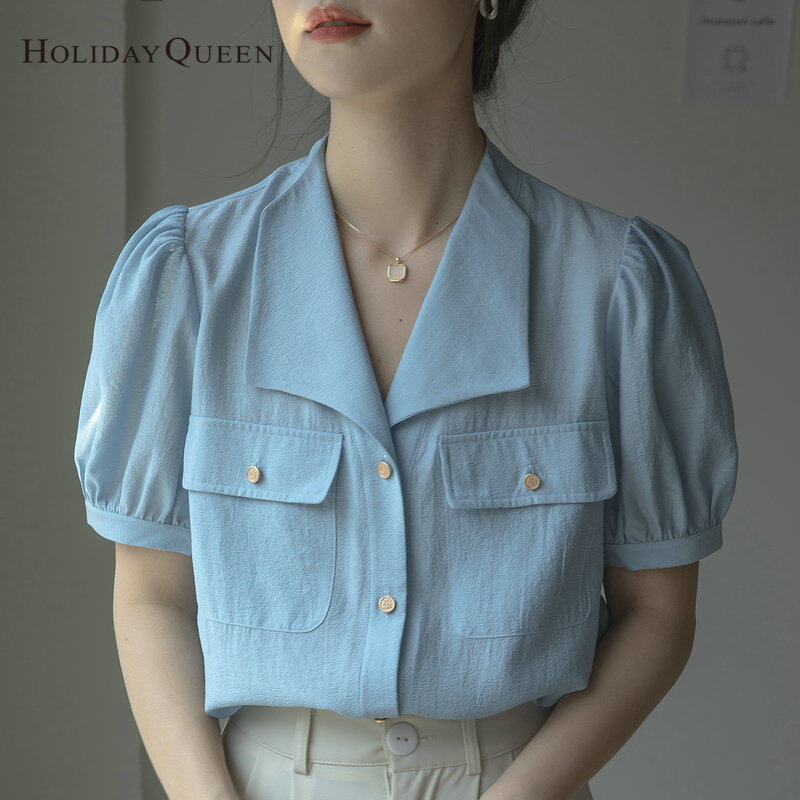 HolidayQueen Ladies Puff Sleeve Shirt 2022 Summer New Fashion French High-End Blue Top S M L XL 2XL Free Shipping HQ1302