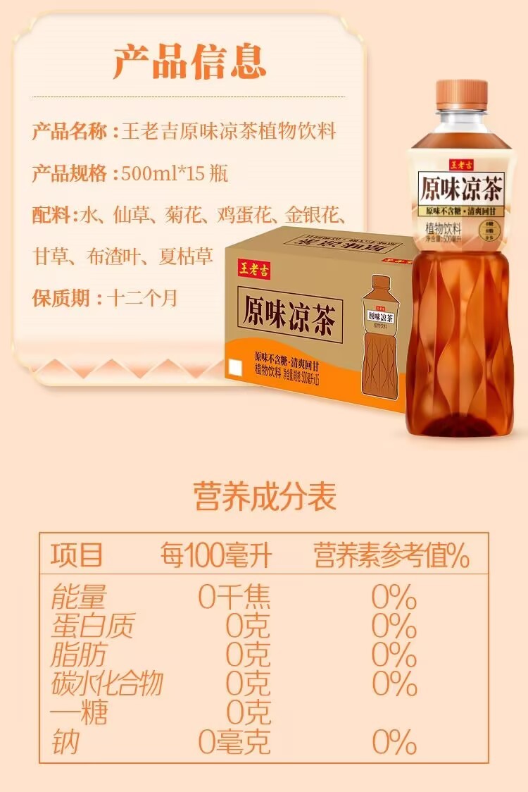 Wang Lao Ji's sugar-free original herbal tea plant beverage 500ml*15 bottles full case